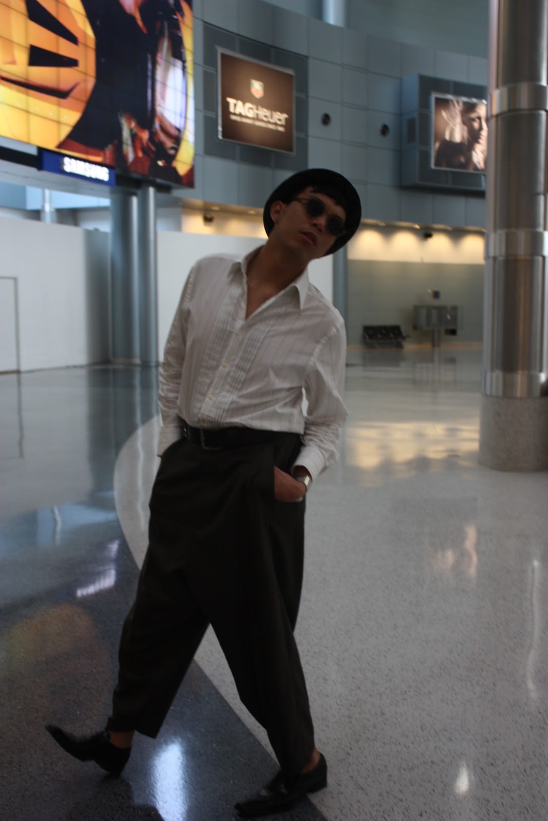 Hat by Zara, Vintage sunglasses, long sleeves and belt by INC, H&M drop crotch trousers, Robert Wayne shoes, Betsey Johnson watch